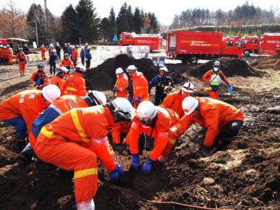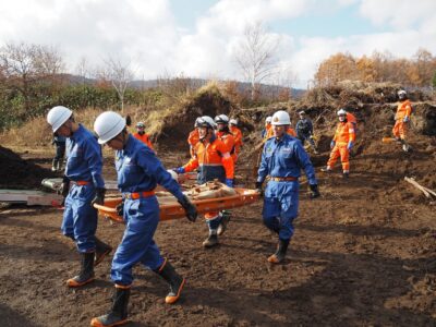 訓練は、急傾斜地で擁壁工事中の複数名の作業員が、崖崩れにより土砂に埋まったとの想定で行われました。