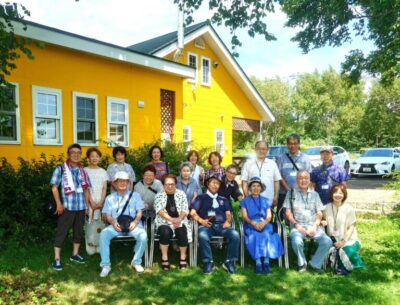 研修バス旅行で訪れた千歳の農園レストラン「花茶」で記念写真