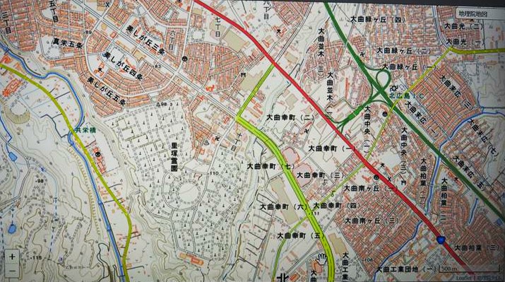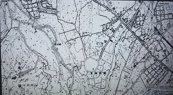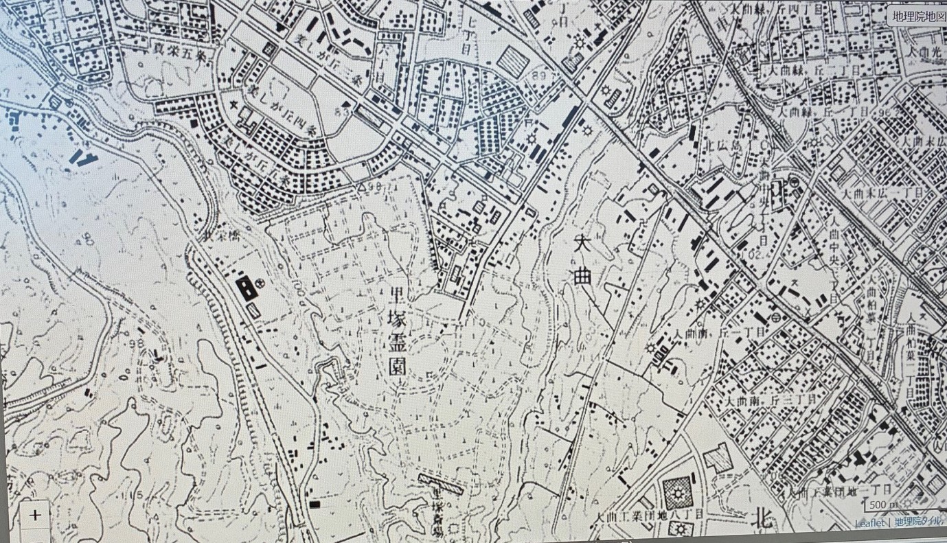 ところが、今はどうでしょうか。現在の国土地理院の地図を見ても分かるように、里塚霊園の際まで住宅がびっしりと建ち並んでいます。
