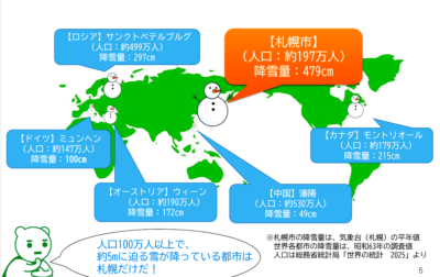 札幌は年間降雪量が5m近くに達し、世界の大都市の中で断トツに降雪量が多い都市です。あるデータによると、ニューヨークの年間降雪量は65~75㎝、ロンドンは5~10㎝、ストックホルムは70~80㎝、モスクワ150~200㎝、北京は5~10㎝程度だそうです。札幌がいかに豪雪都市かが分かります。