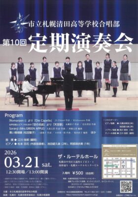 清田高校合唱部は3月21日(土)、第10回定期演奏会をザ・ルーテルホール(札幌市中央区大通西6丁目)で開催します。当日は12時30分開場、13時開演です。