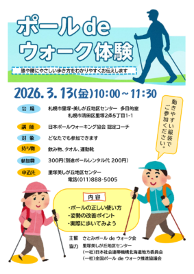持ち物は、飲み物、タオル、運動靴。参加費は300円で、別途ポールレンタル代が200円。申し込みは、里塚・美しが丘地区センター(TEL 011-888-5005)へ。
