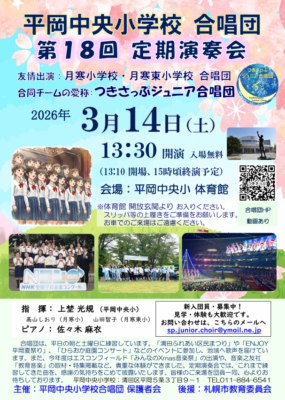 平岡中央小学校合唱団は3月14日(土)、第18回定期演奏会を同校体育館(平岡5条3丁目)で開催します。当日は13時30分開演で、15時ころ終演予定です。入場無料。