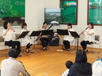 コンサートは11時からと13時からの2回に分けて行われました。PMF修了生を中心とした7人が出演し、フルート、クラリネットなどの木管五重奏やソプラノ、バリトンの声楽家の歌声が会場に響きました。