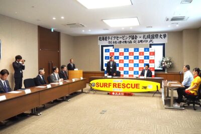 調印式には、北海道ライフセービング協会の国見将之理事長と蔵満保幸札幌国際大学学長ら関係者が出席、調印を交わしました。