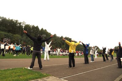 今年はちょっと肌寒い天気でしたが、大勢の人が参加。開会式の後、参加者全員でラジオ体操を行い、今年のスポーツフェスタは始まりました。