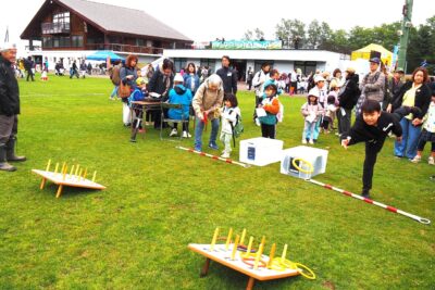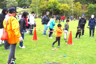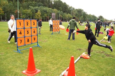 ふかふかの芝生の上で、キックターゲット、ストラックアウト、ディスクターゲット、スナックゴルフなどのゲームスポーツが行われ、子供たちが元気にチャレンジしました。