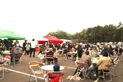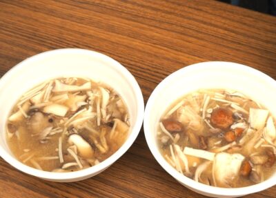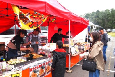 軽食コーナーでは、清田地区商工振興会による特製キノコ汁が販売されたほか、焼きそば、焼き鳥、おにぎり、ドリンクなども販売され、参加者はテーブル席で飲食を楽しみました。