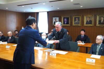 要望書を秋元市長(左)に手交する岡本諒地下鉄東豊線建設促進期成会連合会会長代行(北野地区町内会連合会会長)=2025年10月27日