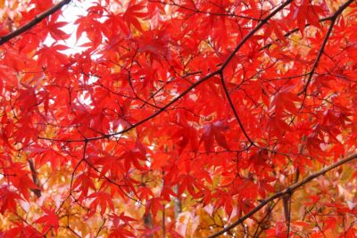 この後、モミジ並木の手前側の紅葉が進み、最後にモミジ並木の奥側が鮮やかな赤色に紅葉します。奥側が紅葉する頃は、並木の中央付近の紅葉は散り始めます。