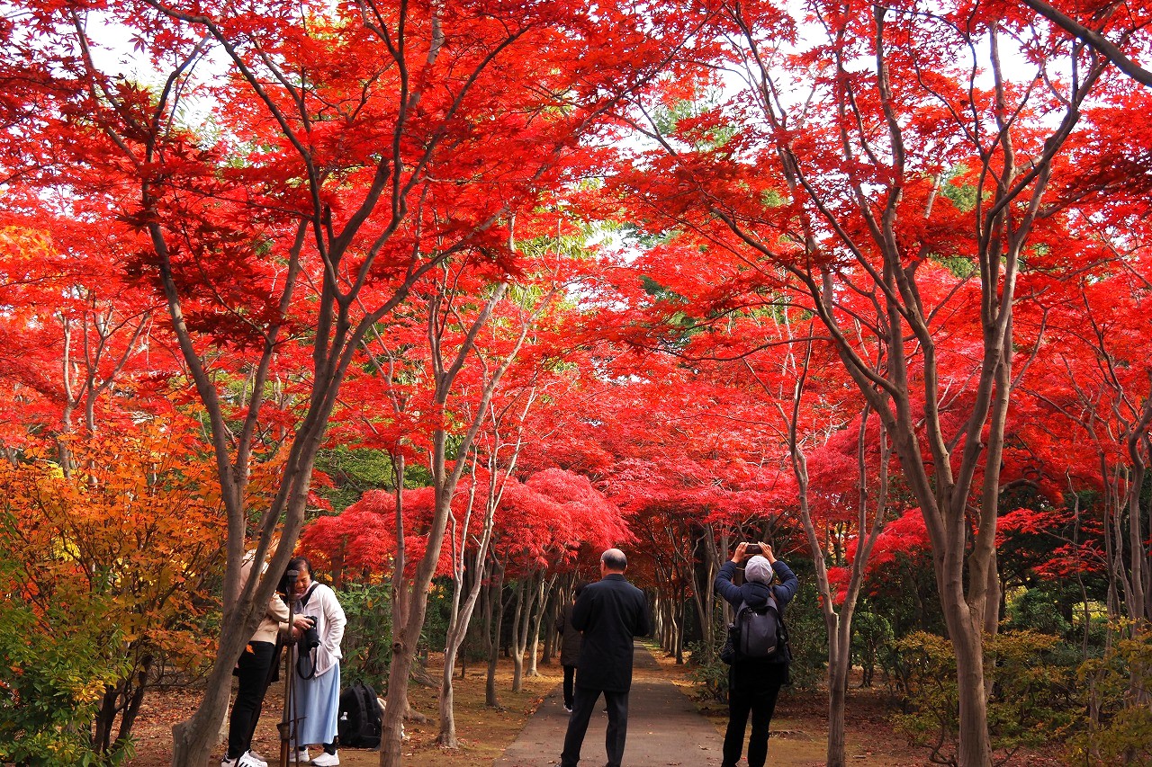 例年、10月下旬から11月初めが紅葉のシーズンで、モミジ並木が鮮やかな赤色になっているのは10月30日現在、まだ並木の真ん中付近だけです。この付近では赤みを増した紅葉が堪能できます。