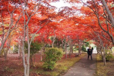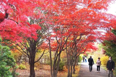 平岡樹芸センター(札幌市清田区平岡4条3丁目)のモミジ並木が赤く紅葉して見頃になってきました。10月30日(木)も朝から多くの人が訪れ、しっとりと落ち着いた園内で秋の風情を楽しんでいました。