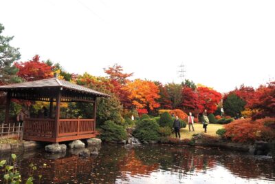 園内は連日、モミジの紅葉を見ようと多くの人が訪れています。モミジ並木以外でも、日本庭園をはじめ木々が赤や黄色に美しく色づき、常緑樹の緑と相まって見事な秋の景色となっています。