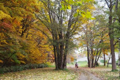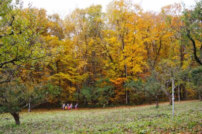 山林内の散策路は落ち葉のじゅうたんのようになっています。サクサクと音を立て、落ち葉を踏みしめて散策する人たち。公園内はとても静かです。