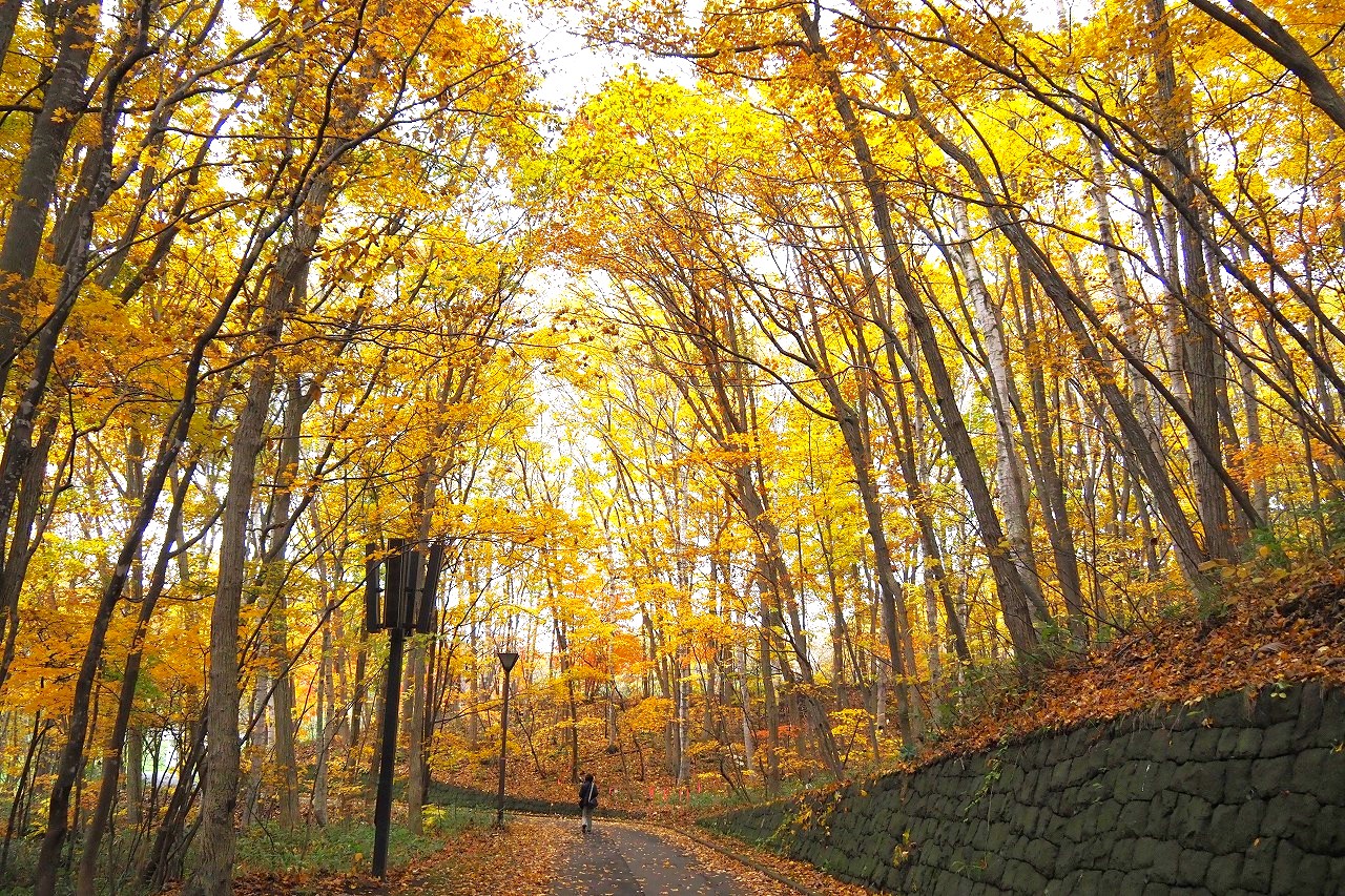 秋深まる平岡公園(札幌市清田区)。カエデ類などの木々がすっかり黄色に色づき、息を飲むような圧巻の秋景色になっています(2025年10月31日)。