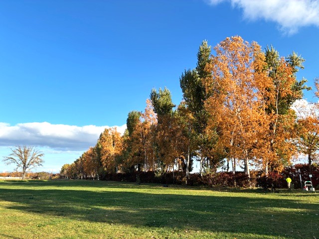 八紘学園(北海道農業専門学校、豊平区月寒東)のポプラ並木の紅葉が、晩秋の青空の下で輝いていました(2025年11月3日)。