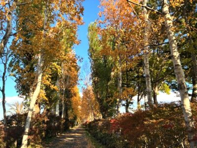 農産物直売所の前、まっすく伸びるポプラ並木。夏の並木も冬の雪景色の並木も素晴らしいですが、紅葉のポプラ並木も美しい景観です。
