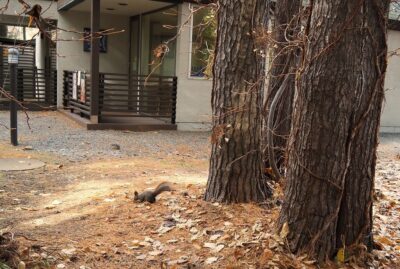 目の前をエゾリスが飛び出してきた。奥の建物は三浦綾子記念文学館の分館(カフェ)