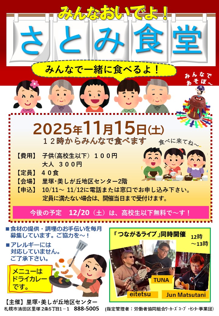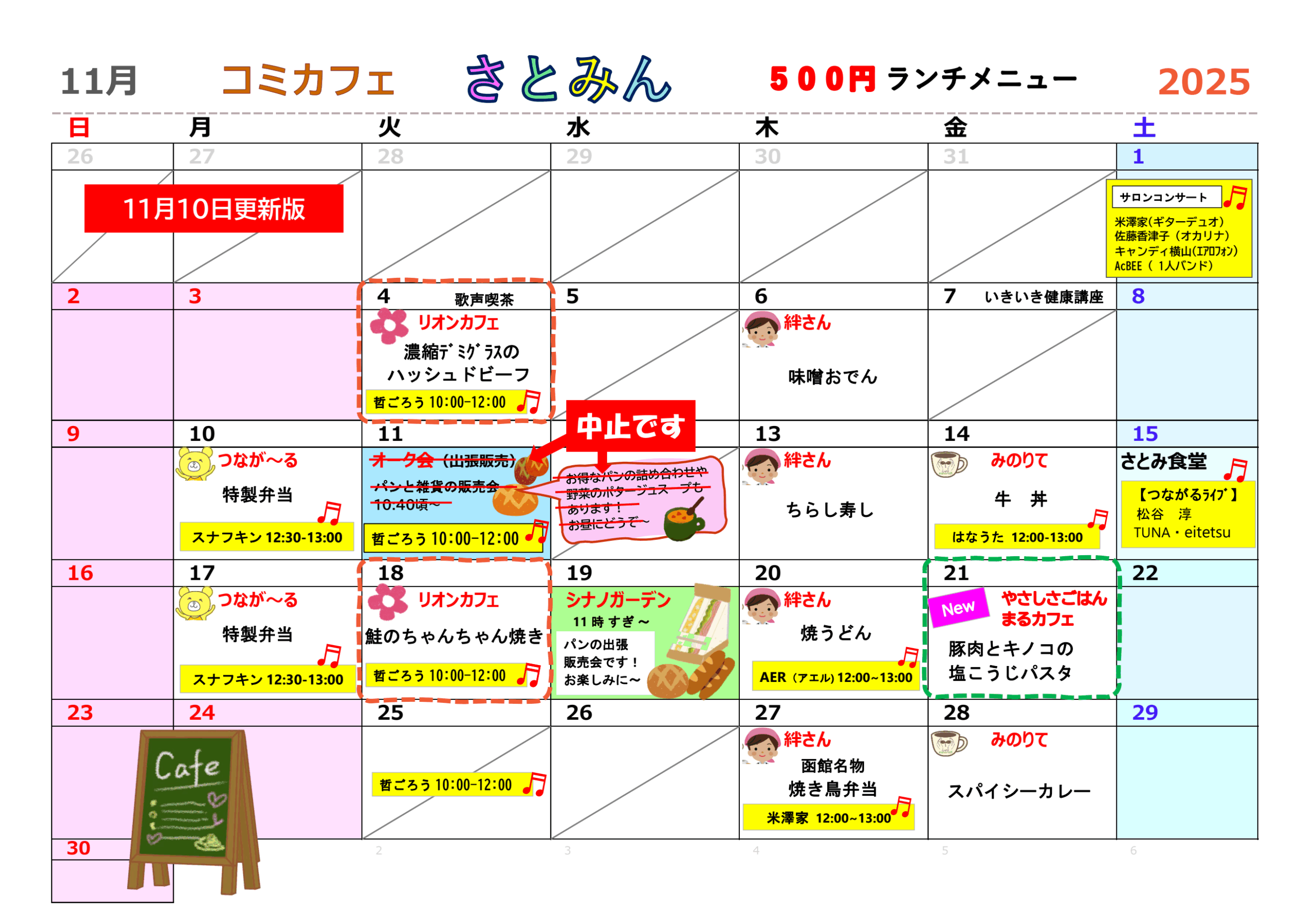 コミカフェさとみん 11月の500円ランチと音楽ライブ情報